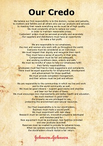 Robert Wood Johnson, former chairman from 1932 to 1963 and a member of the Company’s founding family, crafted Our Credo himself in 1943, just before Johnson & Johnson became a publicly traded company. This was long before anyone ever heard the term “corporate social responsibility.” Our Credo is more than just a moral compass. We believe it’s a recipe for business success. The fact that Johnson & Johnson is one of only a handful of companies that have flourished through more than a century of change is proof of that.